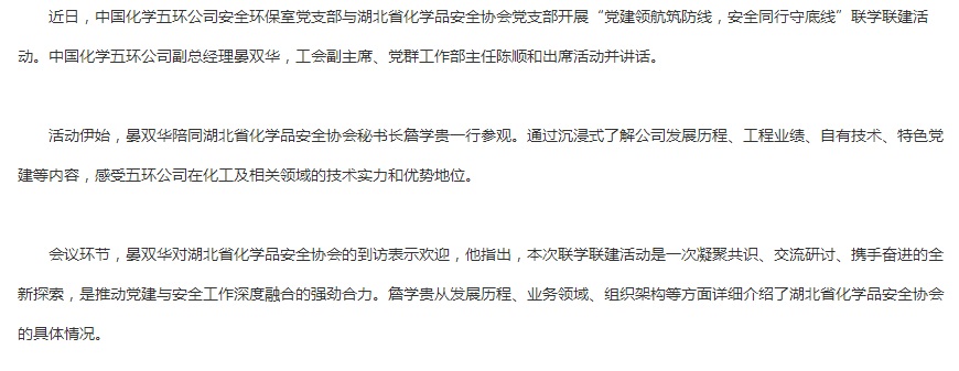 中国化学五环公司安全环保室党支部与湖北省化学品安全协会党支部开展联学联建活动