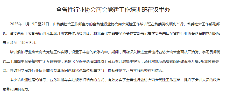 2025年11月25日,在湖北省化学品安全协会召开第四届五次理事会之际,协会党支部同步组织开展了以“智能驱动化工新未来,党建领航安全新高度”为主题的党日活动。