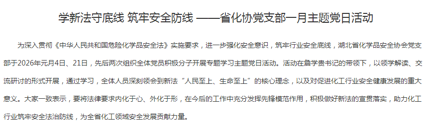 为深入贯彻《中华人民共和国危险化学品安全法》实施要求,进一步强化安全意识,筑牢行业安全底线,湖北省化学品安全协会党支部于2026年元月4日、21日,先后两次组织全体党员积极分子开展专题学习主题党日活动。